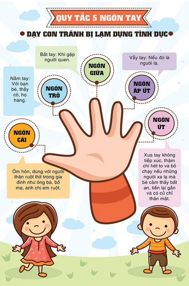 Các tổ chức chuyên bảo vệ trẻ em đã đưa ra những quy tắc khái quát, dễ hiểu để các bậc cha mẹ có thể dạy con mình nhằm hạn chế bị xâm hại. Trong đó, quy tắc 5 ngón tay được coi là hiệu quả và phổ biến. Theo đó, 5 ngón tay là cách hình tượng hóa 5 nhóm người mà trẻ thường gặp hàng ngày. Với mỗi nhóm người, trẻ cần có cách hành xử khác nhau để tránh nguy cơ bị xâm hại.