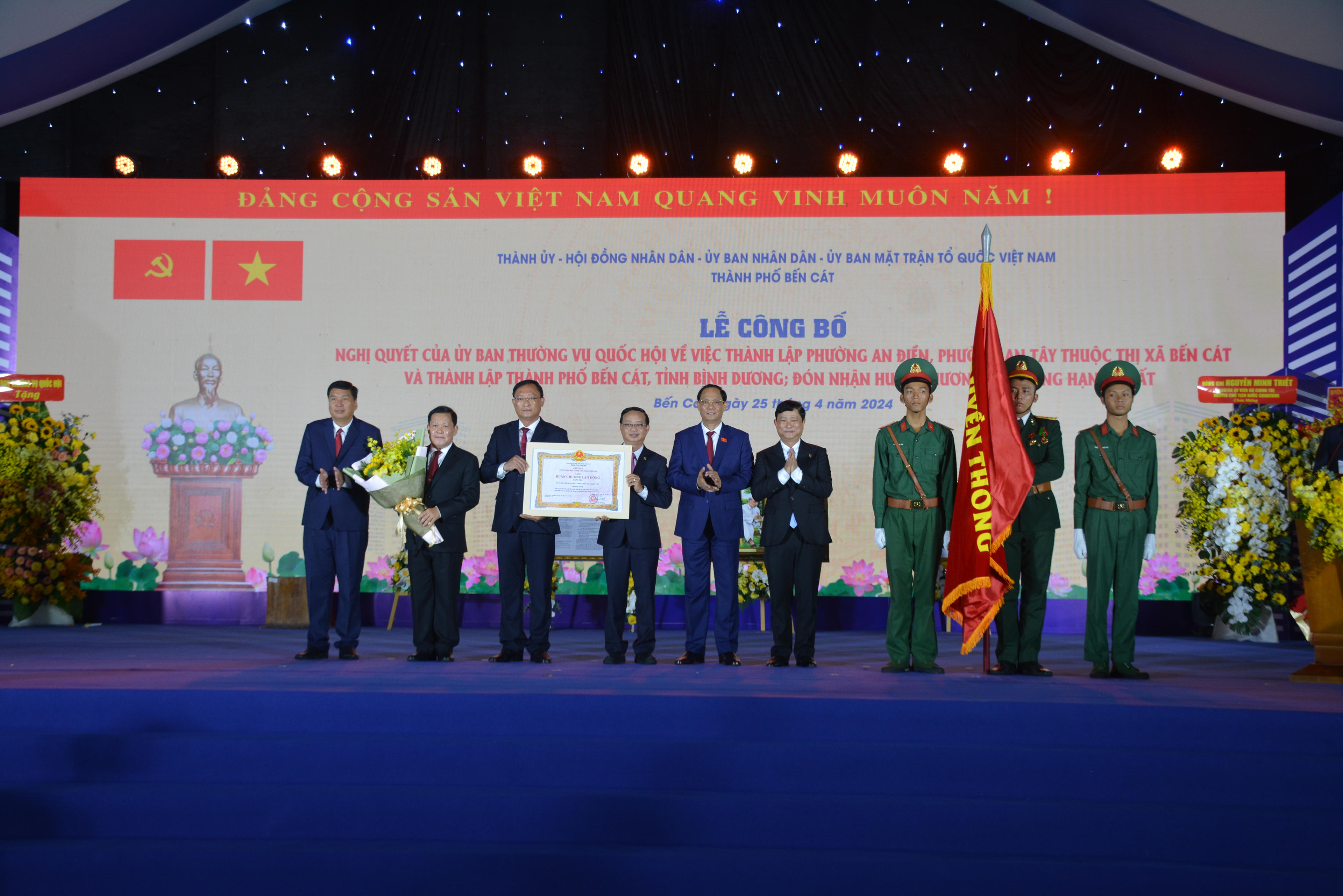 (PLVN) - Sáng 25/4/2024, thành phố Bến Cát tổ chức Lễ công bố Nghị quyết của Ủy ban Thường vụ Quốc hội thành lập phường An Điền, phường An Tây thuộc thị xã Bến Cát và thành lập thành phố Bến Cát, tỉnh Bình Dương; đón nhận Huân chương Lao động hạng Nhất.
