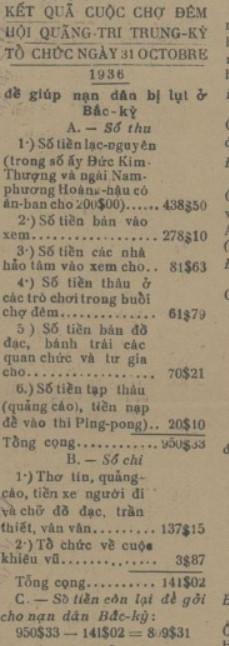 | Kết quả cuộc chợ đêm hội quảng tri Trung Kỳ tổ chức ngày 31-10-1936 để giúp nạn dân bị lụt ở Bắc Kỳ đăng trên Hà Thành Ngọ Báo năm 1936 (Ảnh: Tư liệu). |