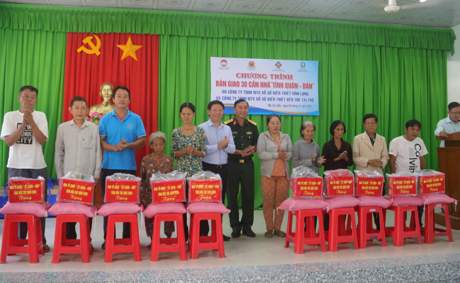 (PLVN) - Ngày 9/1, tại xã Tân Thanh Tây (huyện Mỏ Cày Bắc, tỉnh Bến Tre), UBMTTQVN huyện Mỏ Cày Bắc phối hợp Bộ Chỉ huy Quân sự tỉnh Bến Tre và các nhà tài trợ bàn giao 30 căn nhà “Tình quân – dân” cho gia đình chính sách, hộ nghèo, cận nghèo trên địa bàn huyện.