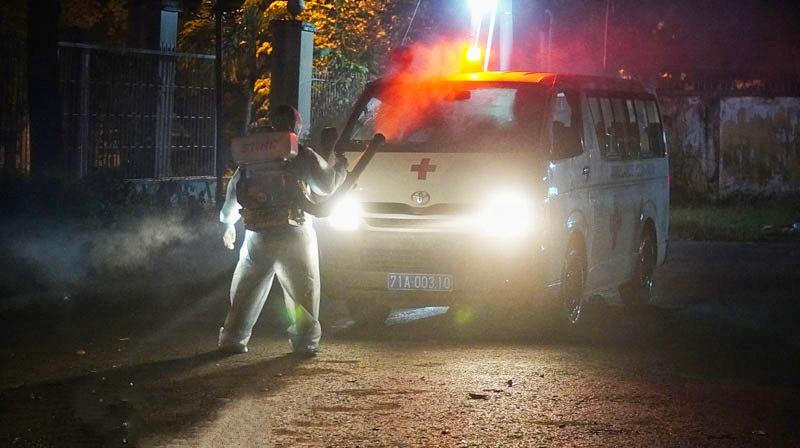 Khử khuẩn xe đưa BN19627 điều trị tại Bệnh viện Lao và Bệnh phổi Bến Tre. |