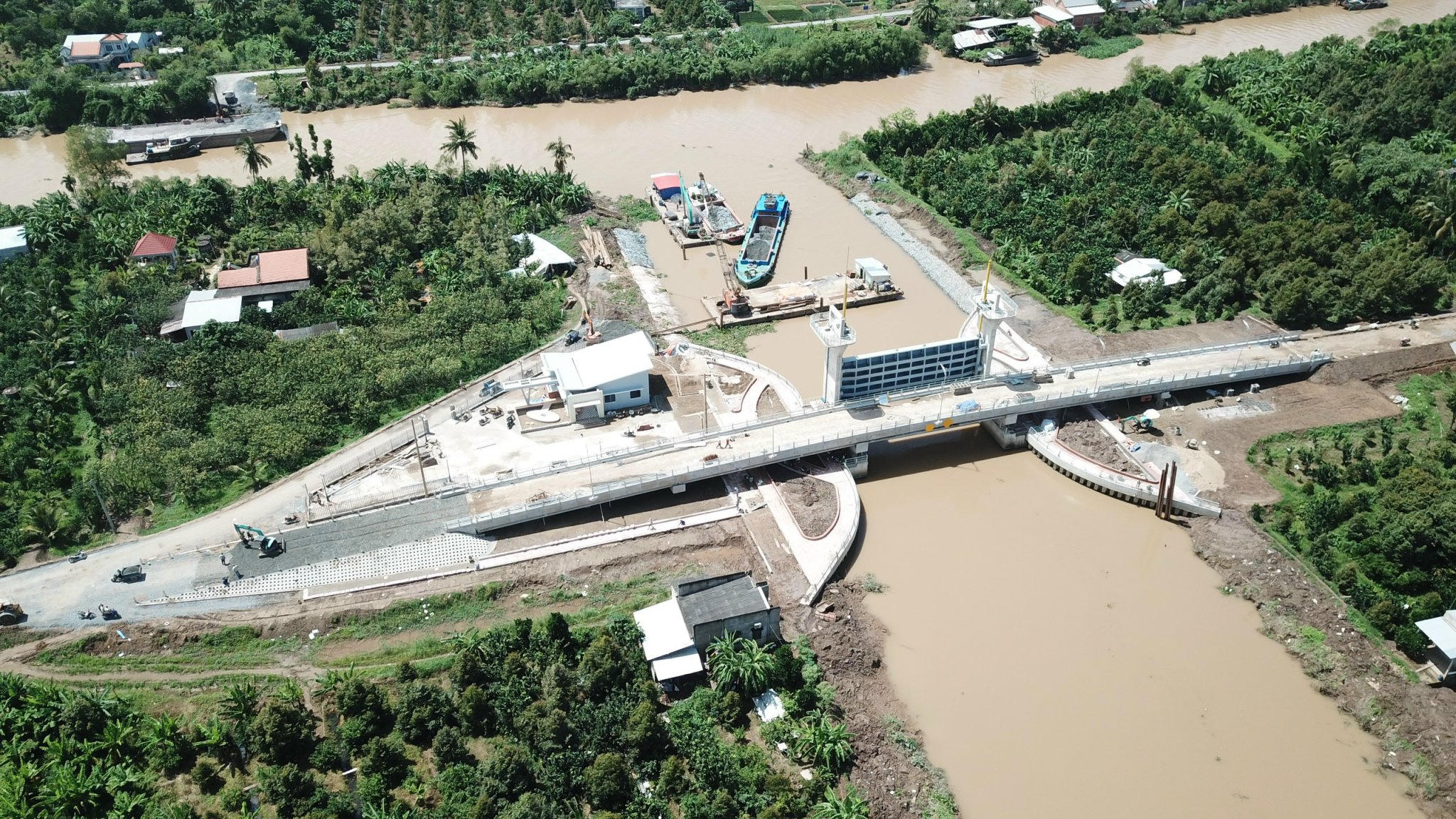 Công trình Cống Tân Phú chống xâm nhập mặn từ sông Tiền và sông Hàm Luông vào thượng nguồn sông Ba Lai. Ảnh: Nhật Trường |