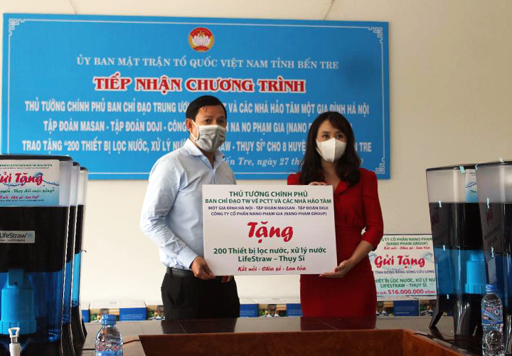 (PLVN) - Ngày 27/3/2020, Ủy ban Mặt trận Tổ quốc Việt Nam tỉnh Bến Tre đã tổ chức tiếp nhận 200 thiết bị lọc, xử lý nước hiệu LifeStraw – Thụy Sĩ với tổng giá trị khoảng 400 triệu đồng để hỗ trợ các huyện bị ảnh hưởng nặng bởi hạn hán và xâm nhập mặn trên địa bàn tỉnh Bến Tre.