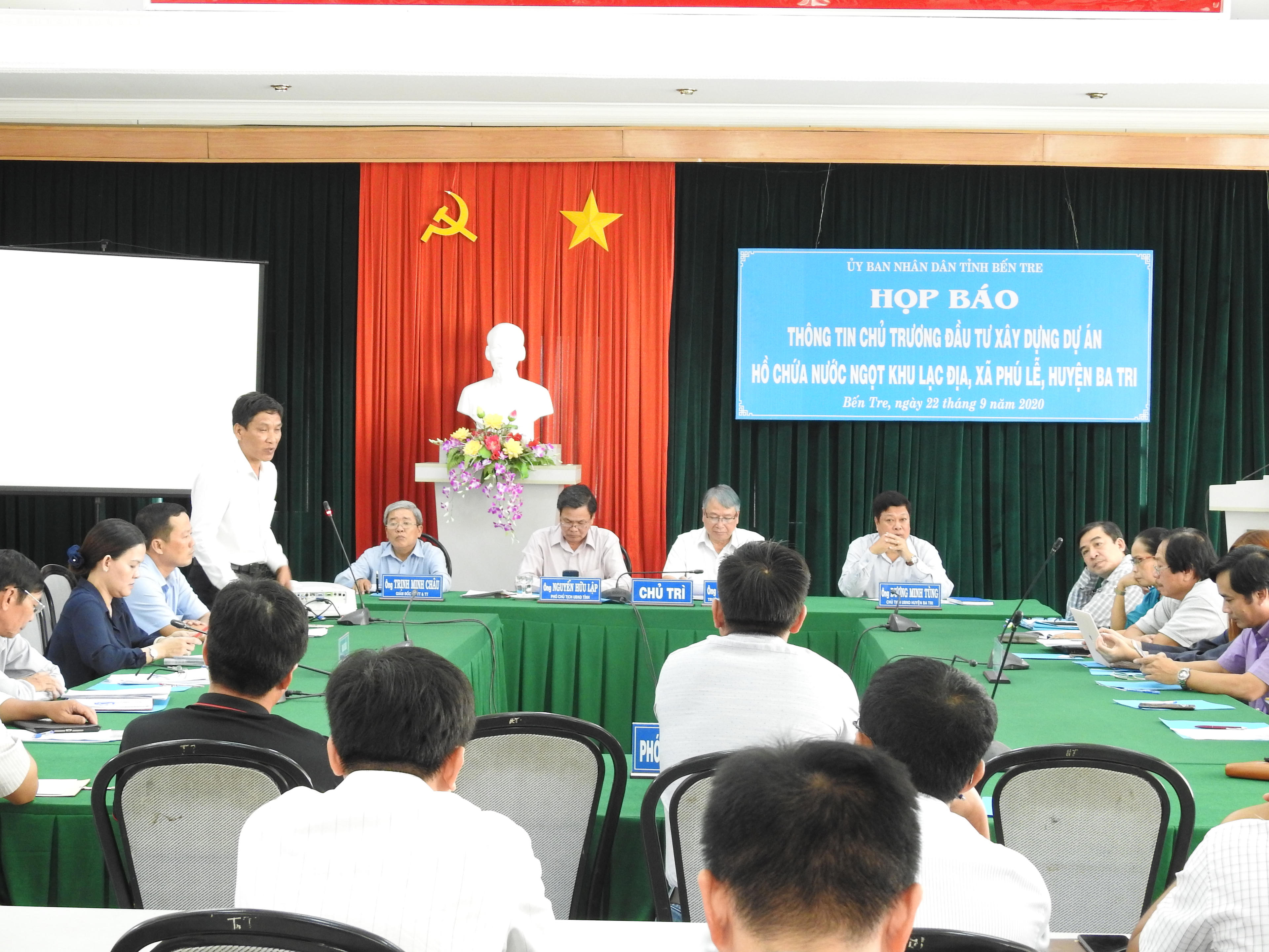 Ngày 22/9, UBND tỉnh Bến Tre tổ chức buổi họp báo thông tin về chủ trương đầu tư xây dựng dự án hồ chứa nước ngọt khu Lạc Địa, xã Phú Lễ, huyện Ba Tri, tỉnh Bến Tre dưới sự chủ trì của Ông Cao Văn Dũng - Trưởng ban Tuyên giáo Tỉnh uỷ.