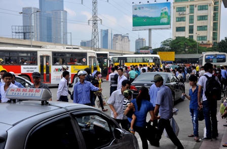 Phía ngoài đường Phạm Hùng (Hà Nội), hành khách được xuống ngay ngoài đường và di chuyển vào bến để giảm sự quá tải trong bến.