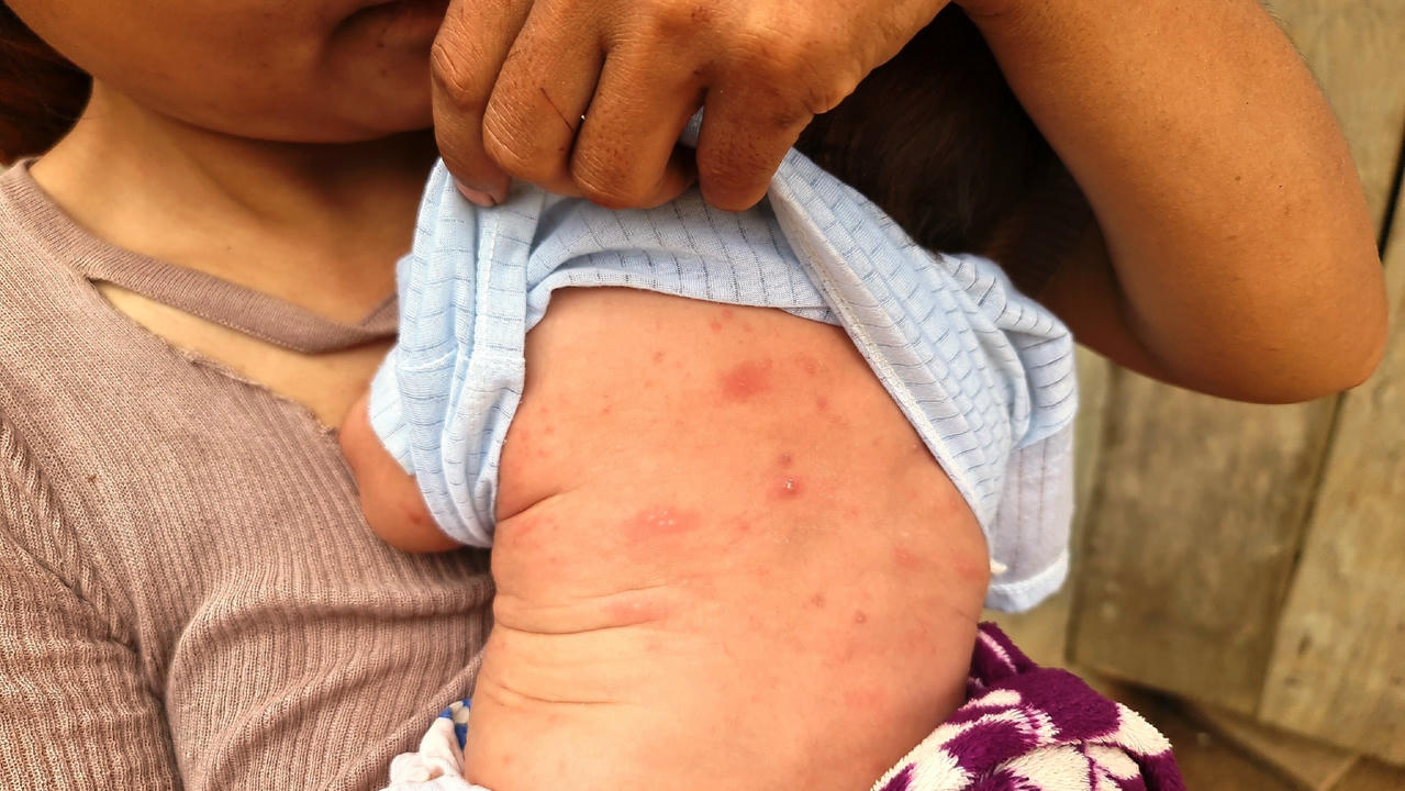 Vừa dỗ đứa con nhỏ mới 10 tháng tuổi khóc ngằn ngặt, chị Hồ Thị Hiền (SN 1988) vừa vạch áo con lên để lộ những nốt ghẻ sần sùi, nốt mới xen nốt cũ. Chị Hiền cho biết, bệnh ghẻ bắt đầu xuất hiện lây lan từ Tết Nguyên đán, nhà chị cả vợ chồng và hai đứa con đều mắc. “Người lớn còn gãi, còn tắm nước lá, chứ trẻ nhỏ chẳng biết làm sao. Buổi tối ngứa khủng khiếp mà không dám gãi mạnh, nốt ghẻ vỡ ra vừa ngứa vừa rát. Thời tiết đang vào mùa nắng nóng lại thêm bệnh ghẻ, rất khổ sở”, chị Hiền nói.
