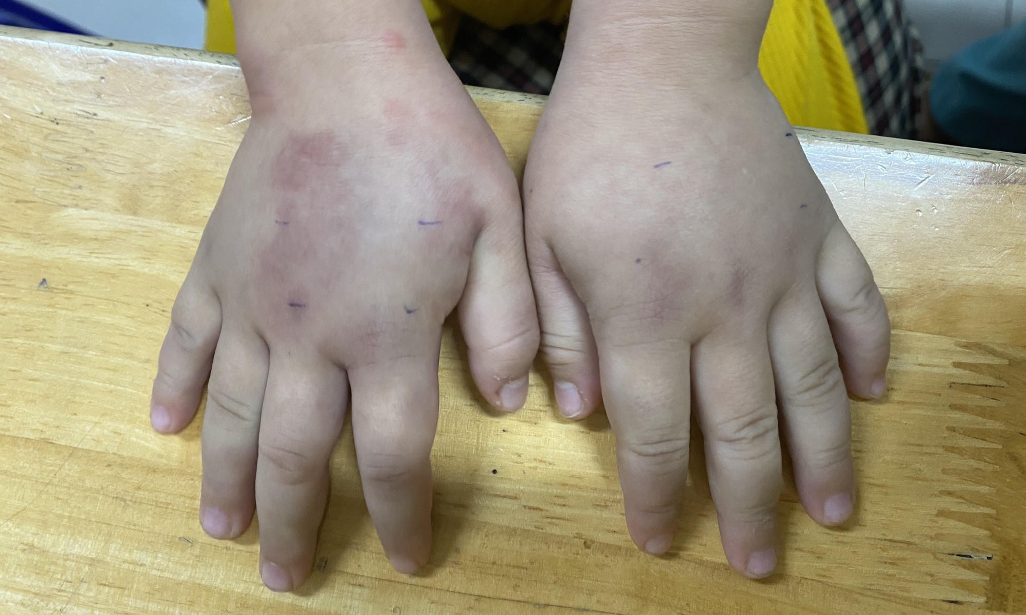 Cùng ngày, người nhà thấy trẻ sưng nề nhiều vùng mu bàn tay, chân, sưng mắt phải, than đau tay chân và quấy khóc nên đưa đi khám và được nhập viện để theo dõi.