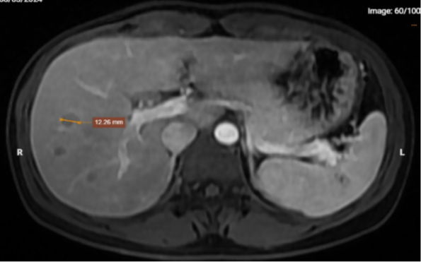 Chụp MRI phát hiện hình ảnh nhiều tổn thương dạng nốt, khối khu trú trong gan của bệnh nhân. |