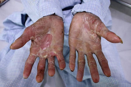 Cách đây khoảng 1 tháng, tay chân, miệng ông bỗng dưng lở loét chảy máu đau đớn. Nghĩ công việc hay phải tiếp xúc với nước bẩn nên bị bệnh da liễu, ông mua thuốc nhưng càng uống càng nặng.