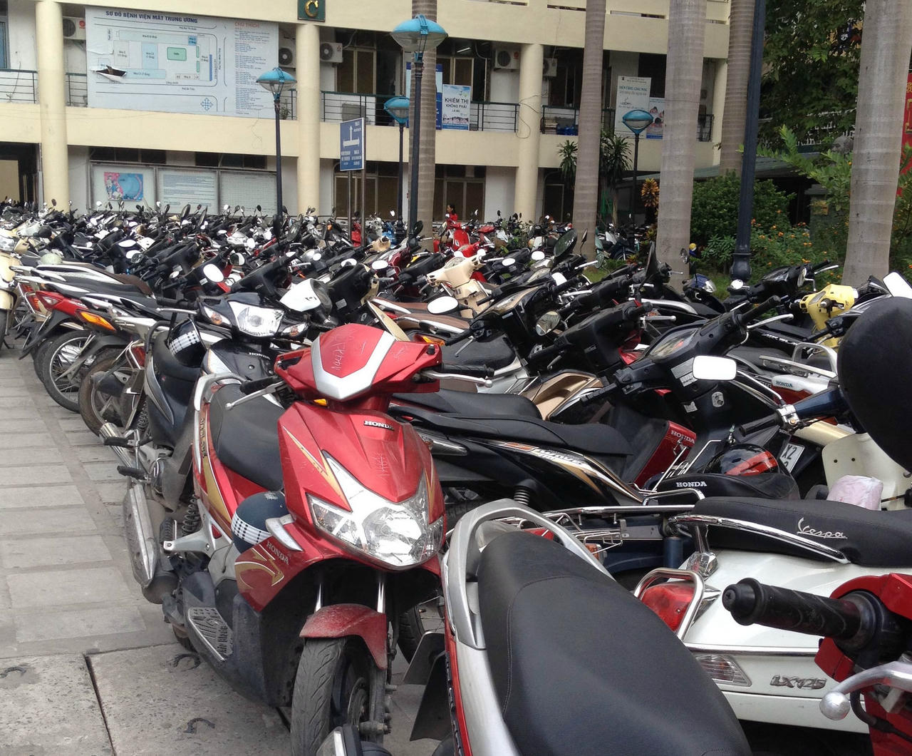 Trong vai một người dân tới gửi xe tại cổng chính Bệnh viện Mắt TW - số 85 Bà Triệu, Hai Bà Trưng, Hà Nội, PV được bảo vệ chặn lại, chỉ đường hướng về phía thu phí vé xe nằm dọc hành lang các đoạn đường quanh bệnh viện. Phải khó khăn lắm chúng tôi mới tìm được chỗ để chiếc xe máy của mình khi phải chen vào các hàng xe san sát.