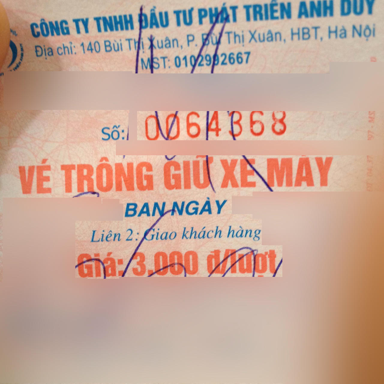 | Tờ vé gửi xe ban ngày tại bệnh viện Mắt Trung ương với giá 3.000 đồng/xe. |