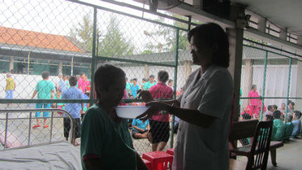 Đối với bệnh nhân nặng, thức ăn phải được cắt nhỏ, xay nhuyễn rồi đút từng thìa một. Bệnh nhân không chịu ăn uống thì phải ngồi dỗ dành như một đứa trẻ. Đối với các bệnh nhân lên cơn lại càng khổ cực hơn, họ không chịu ăn lại quấy phá, các chị phải “đè” bệnh nhân ra “ép” họ ăn cho bằng được. Mỗi lần cho ăn cũng mất hơn một tiếng đồng hồ. Khi bệnh nhân ăn xong thì đã qua mất giờ ngủ trưa.