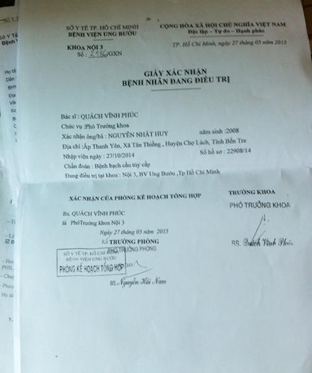 Tháng 8/2014, cháu Huy đau đến ngất xỉu, gia đình hốt hoảng vay mượn tiền đưa cháu lên Bệnh viện Nhi Đồng 1 (TP.HCM) chữa trị. Sau một tháng trời mê man trên giường bệnh, bác sĩ kết luận cháu bị ung thư máu.