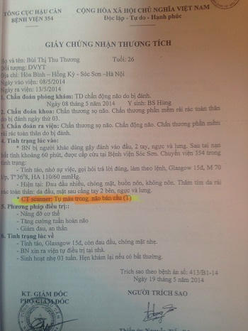 Lần theo sự việc, các LS được biết, BV 354 chỉ chụp MRI sọ não cho chị Thương (hình ảnh sọ não bình thường) mà không hề chụp CT Scanner. Hồ sơ bệnh án của bệnh nhân Thương tại đây cũng chỉ có kết quả Chụp CT Scanner sọ não của BV Bắc Thăng Long (thể hiện “không thấy hình ảnh bất thường nội sọ”) chứ BV Quân đội 354 không tiến hành chụp CT Scanner. Vậy, tại sao BV 354 tại cấp Giấy chứng thương cho Công an huyện Sóc Sơn và khẳng định chị Thương bị “máu tụ trong bán cầu não trái”, sai lệch so với hồ sơ bệnh án?