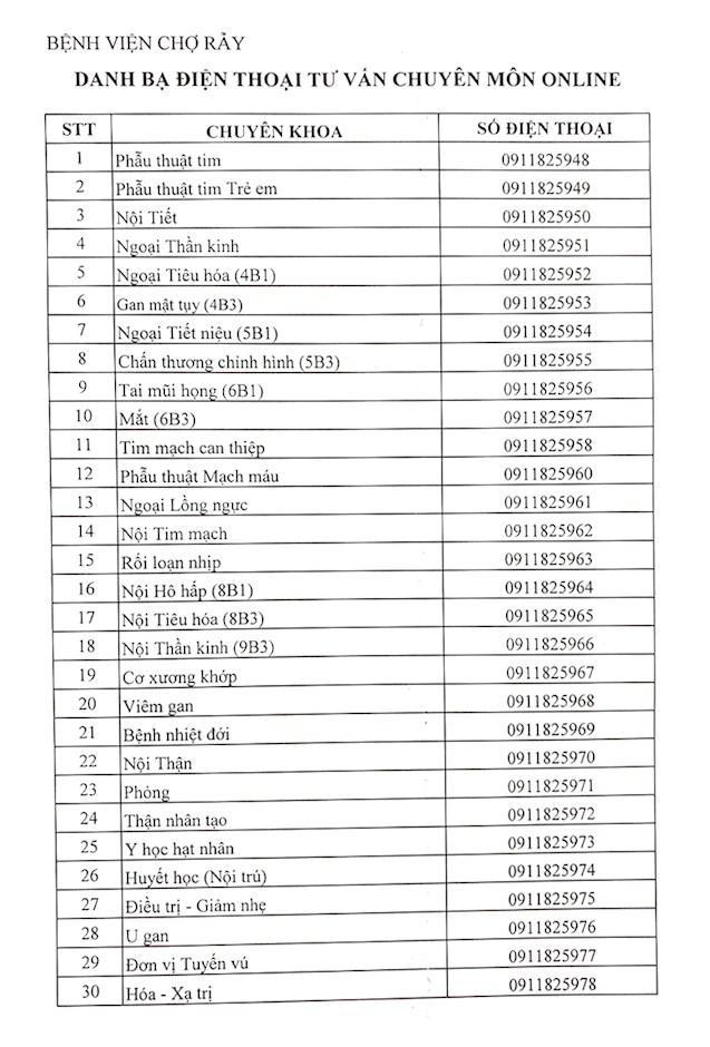 Nhằm giúp bệnh nhân ổn định tinh thần, thân nhân bệnh nhân có thể tự chăm sóc sức khỏe cho người thân theo từng bệnh lý đặc thù, đồng thời phát hiện kịp thời các dấu hiệu bất thường của bệnh, tránh tình trạng đưa bệnh nhân đến cấp cứu trong những tình huống không cần thiết, dẫn đến nguy cơ lây nhiễm COVID-19, nhưng cũng không để bệnh nhân trở nặng mới đưa đến bệnh viện làm lỡ thời gian vàng điều trị, Bệnh viện Chợ Rẫy đưa vào hoạt động 30 số điện thoại di động chuyên tư vấn khám bệnh online qua điện thoại cho bệnh nhân không phải là bệnh nhân COVID-19.