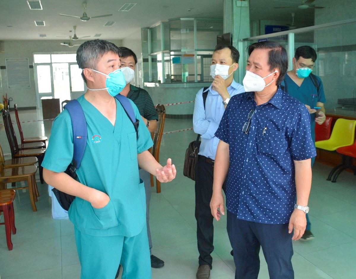 Đại diện Bệnh viện Chợ Rẫy (TP HCM, bìa trái) tìm hiểu thực tế việc tiếp nhận, điều trị tại Bệnh viện dã chiến số 2 (Bệnh viện Y học Cổ truyền tỉnh Cà Mau). |