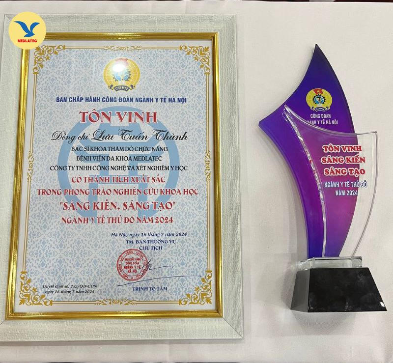 Tại hội nghị Biểu dương cán bộ Công đoàn ngành Y tế Thủ đô tiêu biểu năm 2024; trao kỷ niệm chương vì sự nghiệp xây dựng tổ chức Công đoàn; tôn vinh “Sáng kiến, sáng tạo” ngành Y tế Thủ đô năm 2024,ThS.BSNT Lưu Tuấn Thành - Khoa Chẩn đoán hình ảnh và Thăm dò chức năng, Bệnh viện Đa khoa MEDLATEC vinh dự là 1 trong 48 cán bộ y tế được nhận Bằng khen có thành tích xuất sắc trong phong trào nghiên cứu khoa học “Sáng kiến, sáng tạo” ngành Y tế Thủ đô năm 2024. Đồng thời, là cá nhân duy nhất khối bệnh viện tư nhân nhận Bằng khen tại hội nghị,
