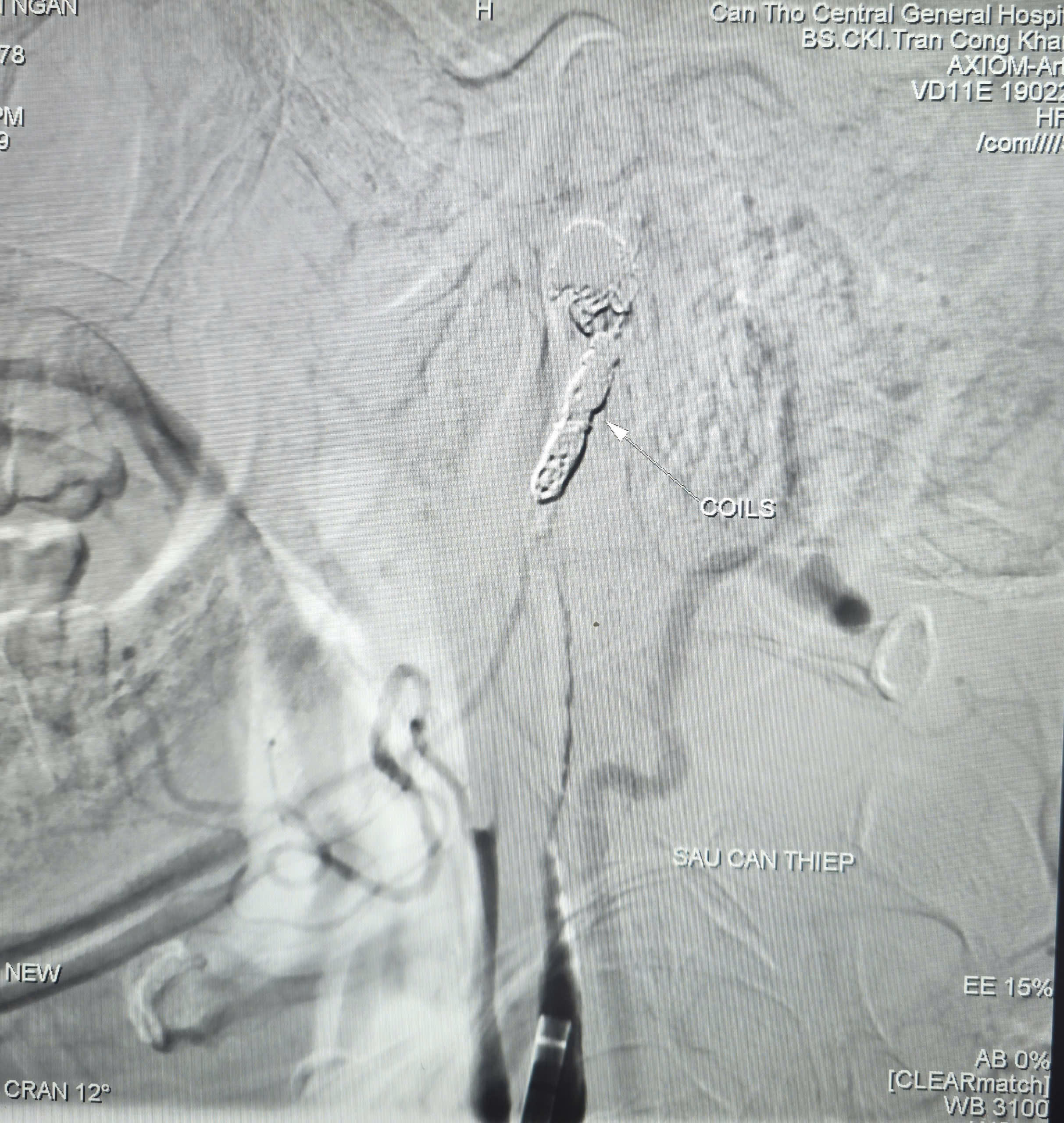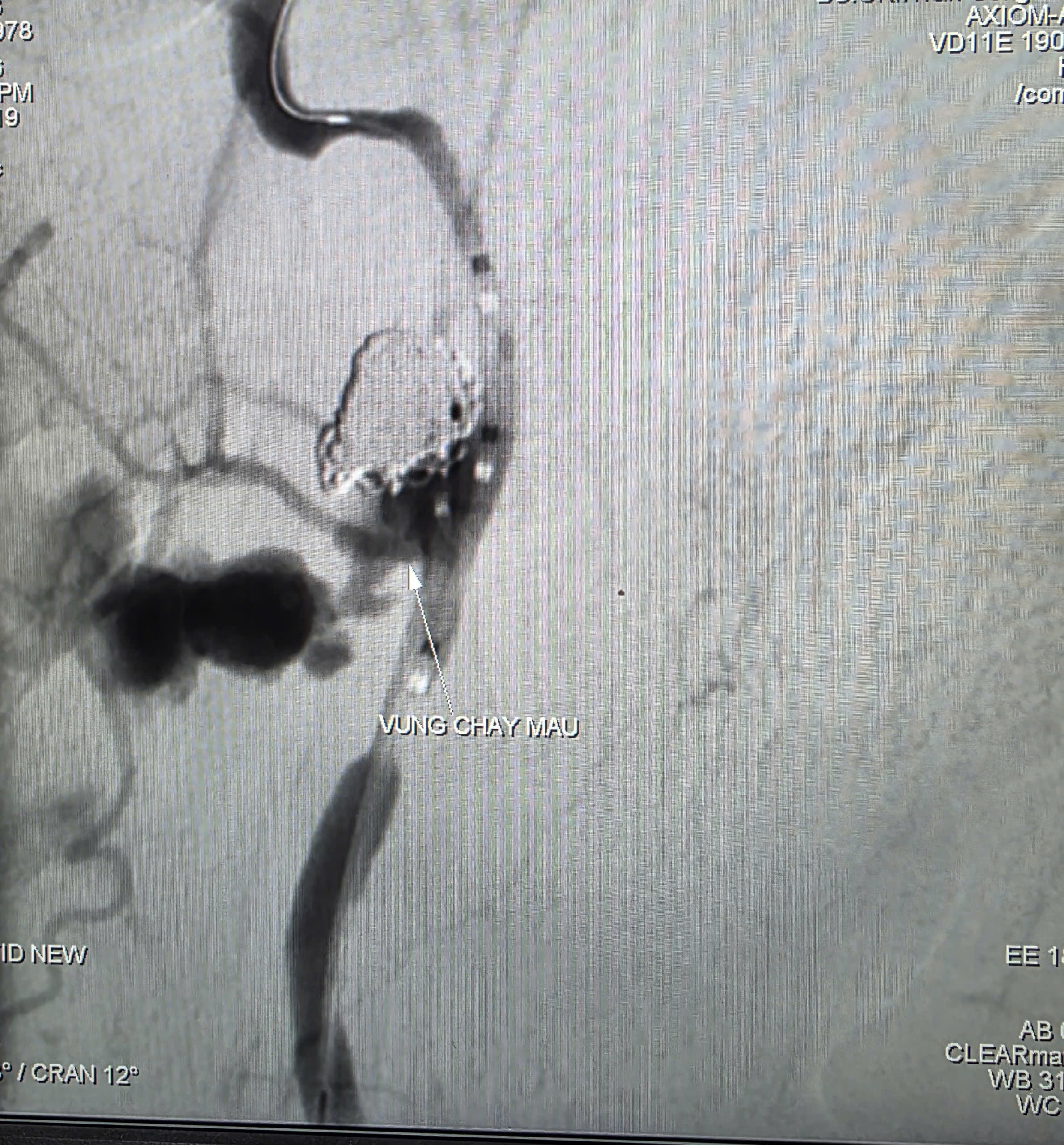 Các bác sĩ quyết định thực hiện chụp và can thiệp cầm máu dưới hệ thống chụp mạch số hóa xóa nền (DSA). Kết quả chụp mạch xác định ổ giả phình động mạch cảnh trong phải đoạn cổ, dưới nền sọ, kích thước khoảng 4,2 x 4,8 mm, cổ túi phình rộng và đang chảy máu.