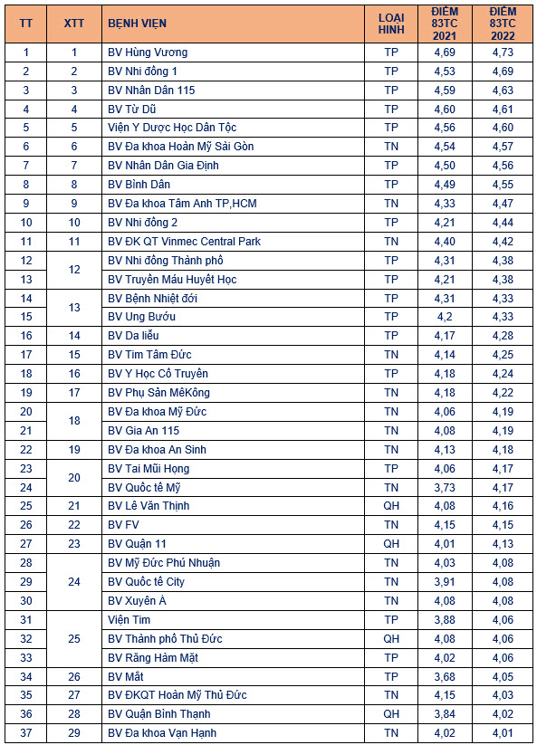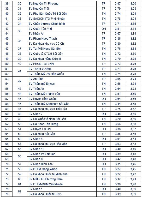 Bệnh viện nào tại TP HCM có điểm chất lượng cao nhất?