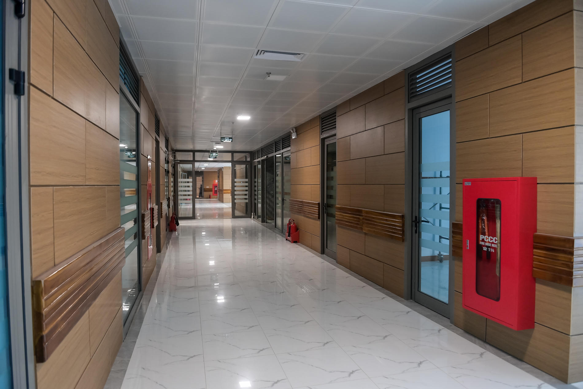 Hành lang bệnh viện lắp đặt đầy đủ hệ thống điều hòa, thông khí, phòng cháy chữa cháy… |