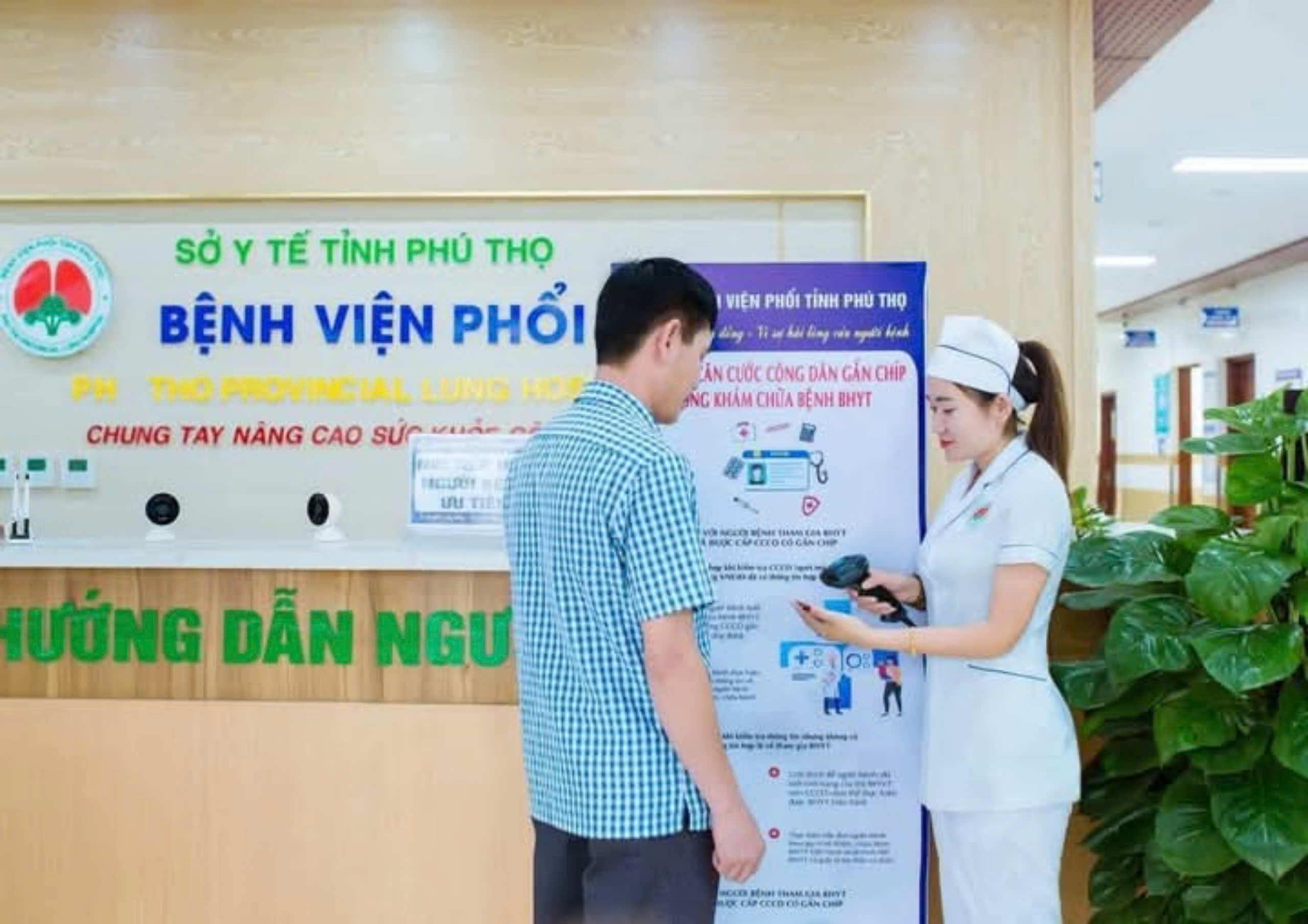 Nhân viên y tế Bệnh viện Phổi tỉnh Phú Thọ hướng dẫn người bệnh quẹt mã CCCD hoặc thẻ BHYT để thực hiện việc khám chữa bệnh. |