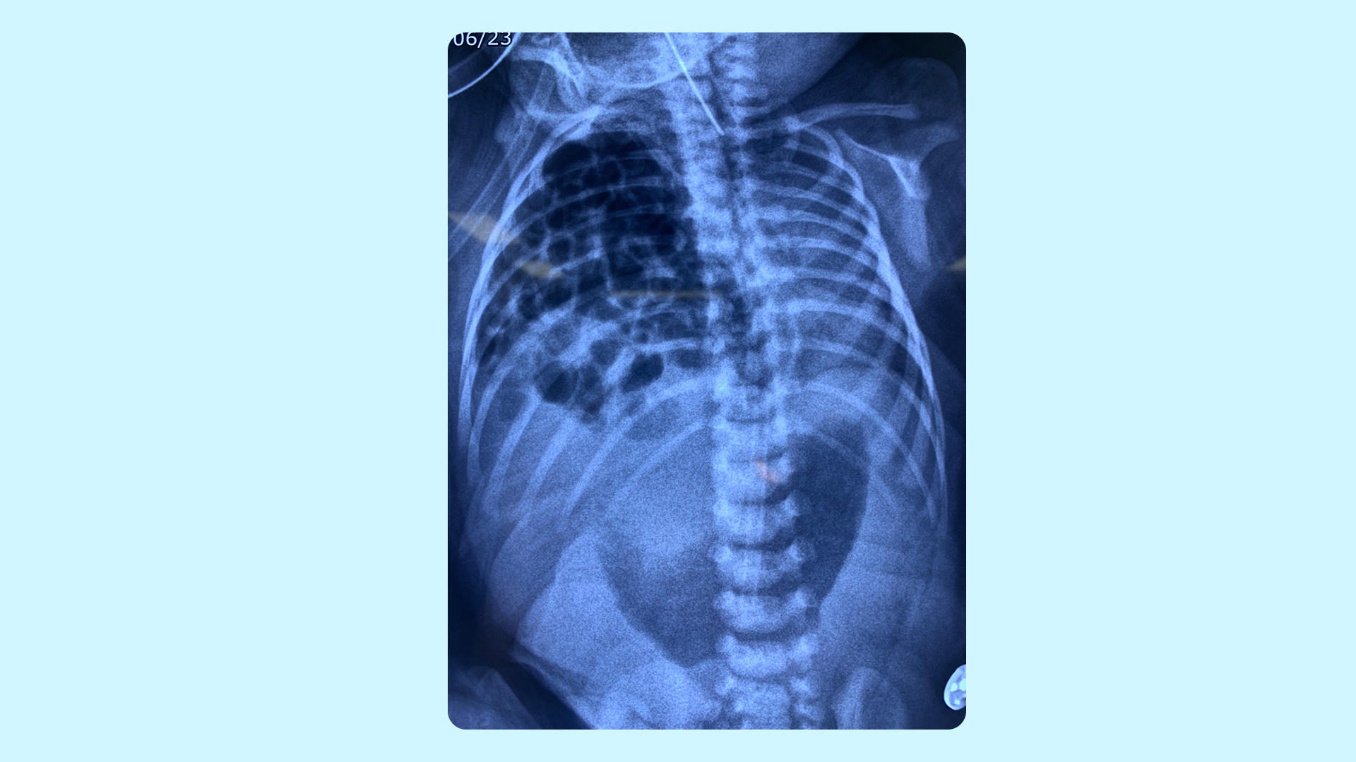 Ngay sau sinh, bé An rơi vào suy hô hấp do cao áp phổi (tăng áp lực trong tuần hoàn phổi), được đặt nội khí quản và phụ thuộc vào máy thở 24/24. Lúc này, nếu phẫu thuật ngay cho bé thì tỷ lệ tử vong rất cao do tình trạng hô hấp chưa ổn định. Ngược lại, nếu để quá lâu, cơ hội sống sẽ mong manh do cao áp phổi kéo dài, nhiễm trùng cơ hội sau đó.