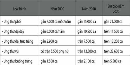Tại hội thảo quốc gia phòng chống ung thư do Bộ Y tế và Hội Ung thư Việt Nam tổ chức gần đây: Nếu năm 2000 Việt Nam chỉ ghi nhận hơn 6.900 ca ung thư phổi ở nam giới thì năm 2010 đã hơn 14.600 ca, dự báo năm 2020 sẽ gần 23.000 ca. Bệnh ung thư dạ dày cũng ngày càng phổ biến khi năm 2010 ghi nhận khoảng 10.000 ca, gấp đôi số ca được phát hiện trước đó 10 năm. Bệnh ung thư vú ở nữ giới là hơn 5.500 ca (năm 2000) thì tới năm 2010 đã vọt lên 12.500 ca và dự báo từ 6 năm nữa trở đi sẽ trên 22.600 ca/năm.