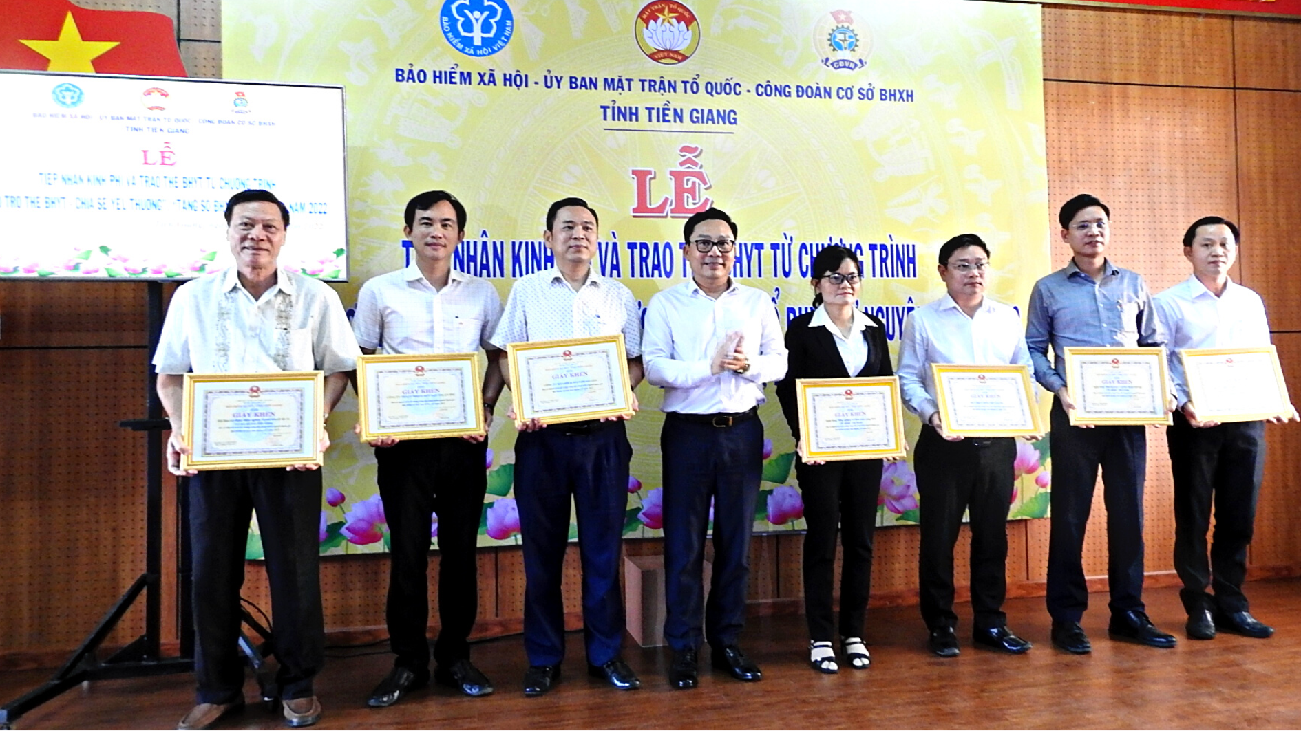 Dịp này, UBND tỉnh Tiền Giang đã trao tặng bằng khen cho đơn vị hỗ trợ thẻ BHYT cho người dân khó khăn trên địa bàn; BHXH tỉnh Tiền Giang trao tặng giấy khen cho 17 tập thể, 4 cá nhân có thành tích xuất sắc trong thực hiện chương trình “Hỗ trợ thẻ BHYT - Chia sẻ yêu thương”, “Tặng sổ BHXH tự nguyện” năm 2022.