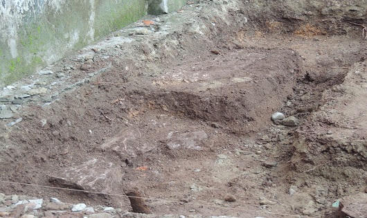 Theo đó, lớp đá này gồm khoảng 5 tảng đá khá lớn đặt theo 2 hàng ngay ngắn vuông góc với nhau, đoạn giữa có khuyết một đoạn không có đá. Riêng đoạn cuối lớp đá ở hàng song song với bờ tường và khá giống lớp đất lạ ở hố thứ 3 ở nhà ông Nguyễn Hữu Oánh tìm nghi liên quan công trình kiến trúc.