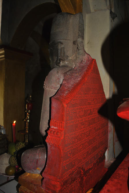Đặc biệt, lưng tượng là một tấm bia hình ngũ giác cao 60 cm, rộng 45 cm, có 12 dòng chữ Chăm cổ đến nay vẫn chưa ai dịch nghĩa được. Được biết, Viện Viễn Đông bác cổ ở Pháp sang cũng đã lấy mẫu chữ đằng sau pho tượng Phật Lồi về nghiên cứu nhưng chưa có kết quả.