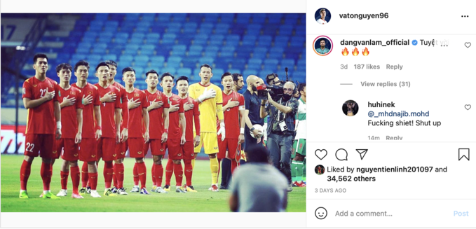 Ngay sau đó, trang instagram của Văn Toàn bị CĐV Malaysia spam hàng loạt bình luận khiếm nhã. Bức ảnh tiền đạo của đội tuyển Việt Nam đăng tải từ 3 ngày trước nhận sự tương tác đột biến, với hơn 34.000 lượt thích và gần 3.000 bình luận. Phần nhiều trong số này đến từ người hâm mộ Malaysia. Nhiều CĐV nước này cho rằng tiền đạo số 9 giả vờ ngã để kiếm phạt đền.