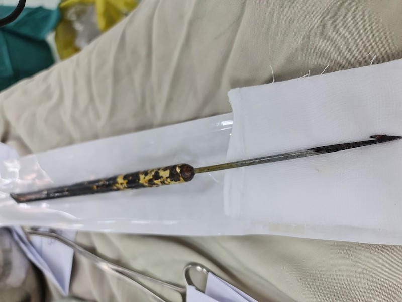 Được biết, bệnh nhân tên N.V.C, 31 tuổi, ngụ tại huyện Cờ Đỏ, TP Cần Thơ. Bệnh nhân nhập viện trong tình trạng bị vật nhọn đâm thủng ngực phải, dị vật bộc lộ bên ngoài dài khoảng 20cm.