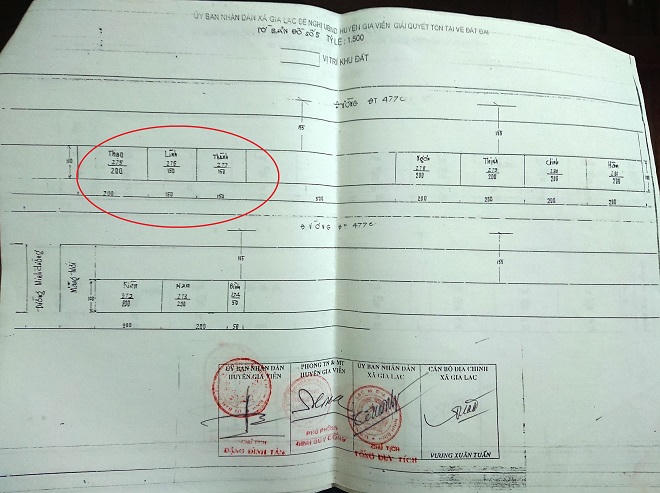 Cho rằng có sự chen ngang trong quá trình cấp đất, ông Đinh Văn Thạo (ở xã Gia Lạc) đã có nhiều đơn thư gửi đến các cơ quan chức năng. Ngày 16/1/2018, thực hiện ý kiến chỉ đạo của Chủ tịch UBND tỉnh Ninh Bình, Phó chánh văn phòng Đặng Xuân Nguyên đã ký công văn số 39/VP-UBND chuyển đơn của ông Thạo tới UBND huyện Gia Viễn xem xét, giải quyết, báo cáo kết quả về UBND tỉnh.