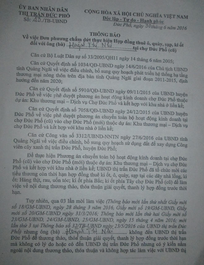 Bởi những lí do trên, nên 400 tiểu thương không đồng ý di dời sang trung tâm thương mại. Sau nhiều buổi làm việc, đối thoại không thành, ngày 30/6/2016, UBND thị trấn Đức Phổ đã gửi cho các hộ kinh doanh thông báo đơn phương chấm dứt hợp đồng thuê quầy, ki ốt tại chợ Đức Phổ từ ngày 1/7/2016.