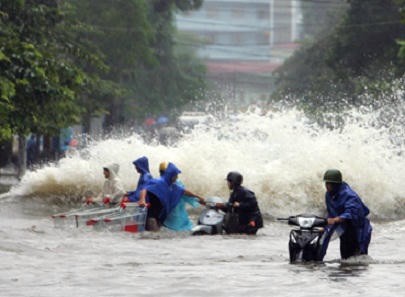 Mỗi lần các xế hộp phóng qua "sông", nhiều xe máy bị sóng đánh ngã dúi dụi. Mọi người thi nhau "bơi", đẩy, vác xe vượt "biển nước".