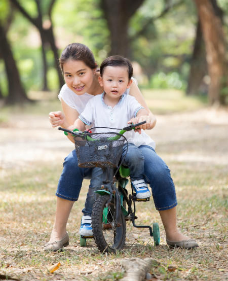 Khi bé sợ đạp xe, mẹ nên khuyến khích và tạo động lực cho con. |