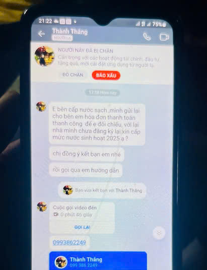 Cụ thể, khoảng 18h ngày 5/5, chị N.T.H (trú tại tổ 10, khu 2, phường Giếng Đáy, TP Hạ Long, Quảng Ninh) nhận được cuộc gọi từ người xưng là nhân viên của Công ty CP Nước sạch Quảng Ninh, yêu cầu kết bạn qua zalo để hướng dẫn cài app chăm sóc khách hàng, nhận thông báo tiền sử dụng nước hàng tháng của Công ty.