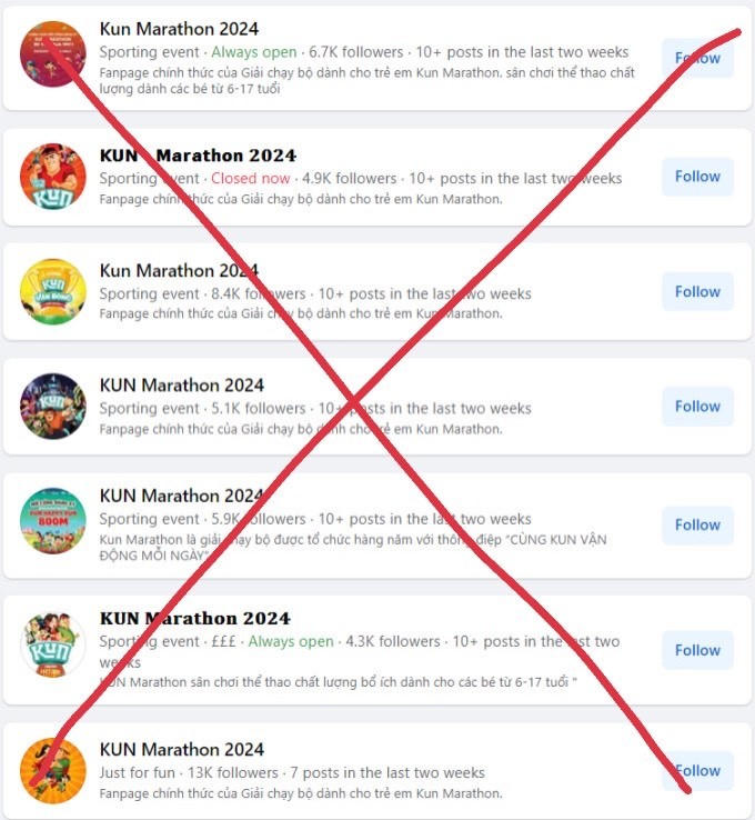 | Một số fanpage giả mạo Kun Marathon trên facebook |