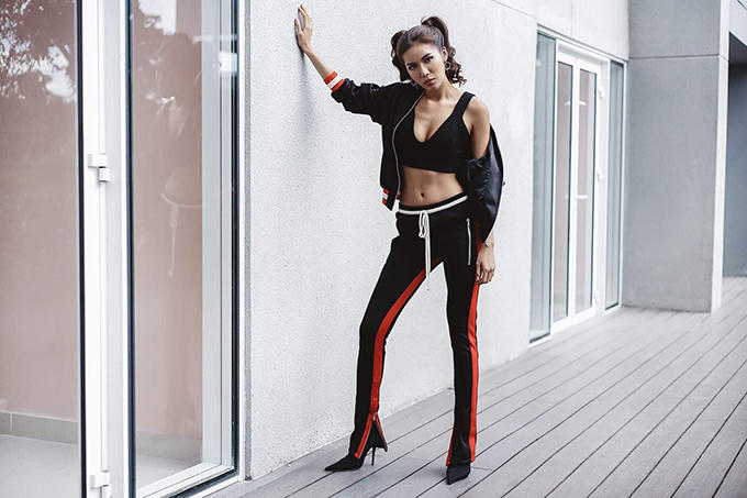 Minh Tú khỏe khoắn cùng quần kẻ sọc