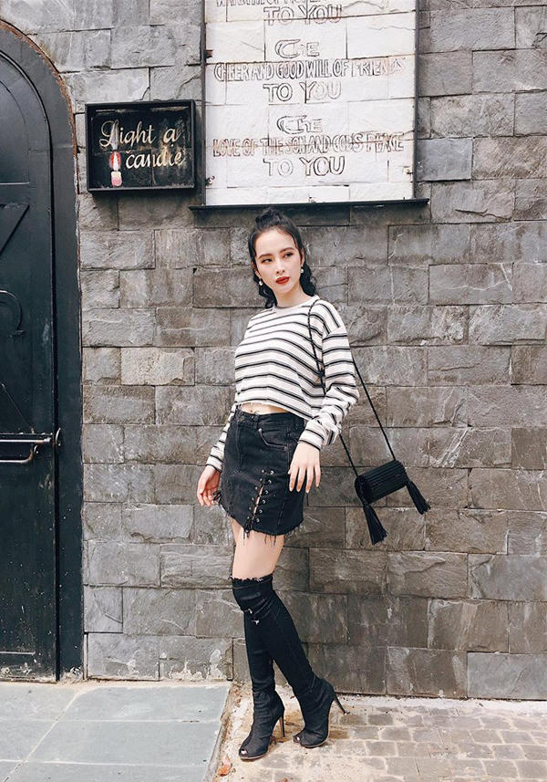 Angela Phương Trinh chia sẻ, tuyệt chiêu để giúp bản thân "ăn gian" chiều cao một cách hiệu quả là khéo léo chọn lựa các chân váy ngắn và kết hợp chúng với bốt cổ cao theo tỷ lệ thích hợp. Lối mix đồ này ngoài việc tôn vóc dáng còn giúp bạn gái thể hiện sự sành điệu với mốt bốt cổ cao thịnh hành ở mùa thời trang 2017/2018.