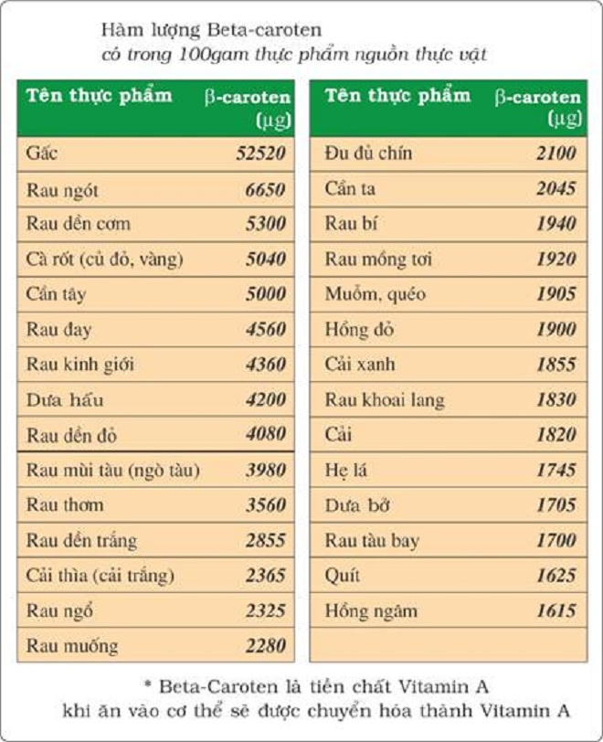 - Beta-caroten: Là tiền chất vitamin A chứa nhiều trong thực vật, nhất là rau, quả có màu vàng, đỏ (cà rốt, cà chua, bí đỏ, cam, xoài, đu đủ, dưa hấu) và các loại rau có lá xanh sẫm (như rau muống, rau ngót, cải bó xôi).