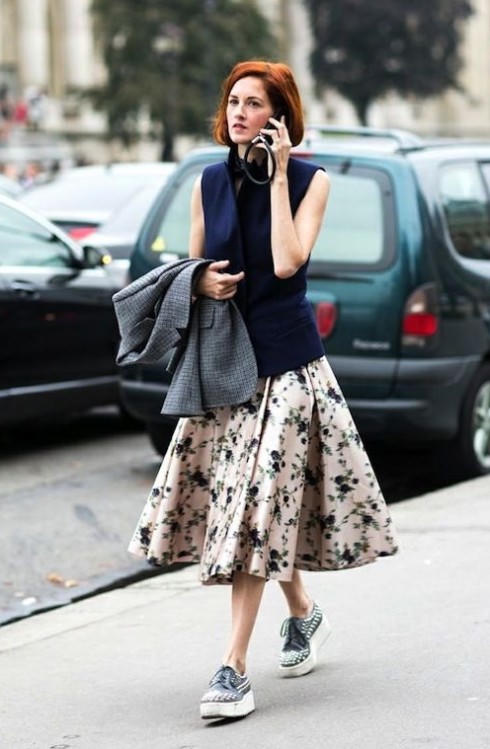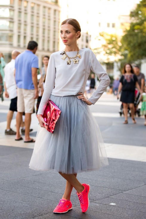 Để đảm bảo có bộ cánh hoàn hảo, thay vì chọn giày vải buộc dây đơn giản, nên chọn những đôi có màu sắc rực rỡ cùng áo thun trơn, phụ kiện cá tính. Lưu ý, khi phối với váy xòe, áo cần ngắn trên hông hoặc ôm để đóng thùng.