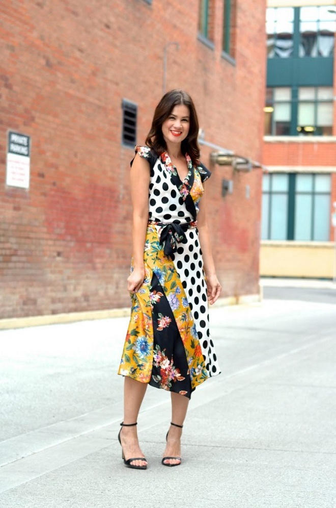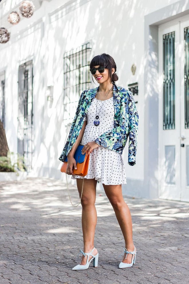 Không gì thú vị hơn bằng việc kết hợp hai hoạ tiết đặc trưng từ hình ảnh trẻ trung của phái nữ và có khả năng giúp tâm trạng người diện luôn tươi vui với nhau. Hoạ tiết hoa được thiết kế với nhiều màu sắc vì vậy để tránh làm rối, bạn hãy chọn màu trung tính khi kết hợp với hoạ tiết chấm bi.