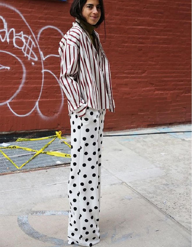 Chấm bi và kẻ sọc sẽ là hai hoạ tiết hỗ trợ nhau tạo hiệu ứng đồ hoạ hay ho cho người mặc. Để có được kết quả tốt nhất, hãy chọn cùng một tông màu cho cả hai hoạ tiết. Bạn có thể phối sọc mỏng với chấm bi có kích thước lớn và ngược lại. Tuy nhiên, những đường sọc và chấm bi nhỏ vẫn có thể “ăn ý” với nhau.