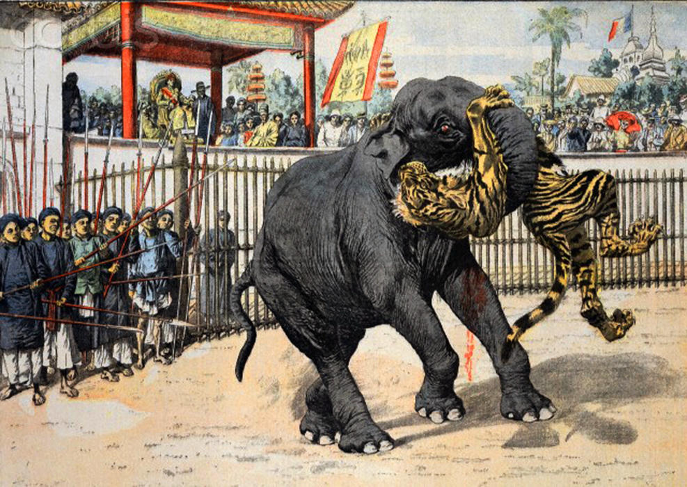 | Theo cách gọi “long sàng” giường của vua, “long nhan” mặt vua, thì trong bức tranh người Pháp vẽ đây phải là “long tượng”, là “voi của vua” |