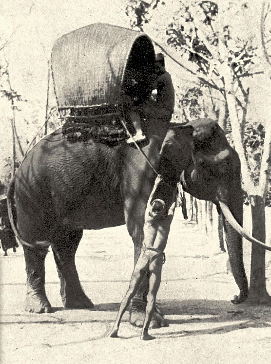 Khi nó không chịu nghe lệnh truyền và không nhanh nhảu làm theo thì quản tượng đứng hai chân trên đầu nó, đánh và trị nó rất nặng, rất cương quyết, lấy roi quất mạnh trên trán nó. Có lần mấy người chúng tôi cùng đi chung một voi chở chúng tôi, người quản tượng đánh nó như chúng tôi vừa nói, mỗi lần roi quất trên nó, chúng tôi tưởng như nó sẽ ném chúng tôi xuống đất.