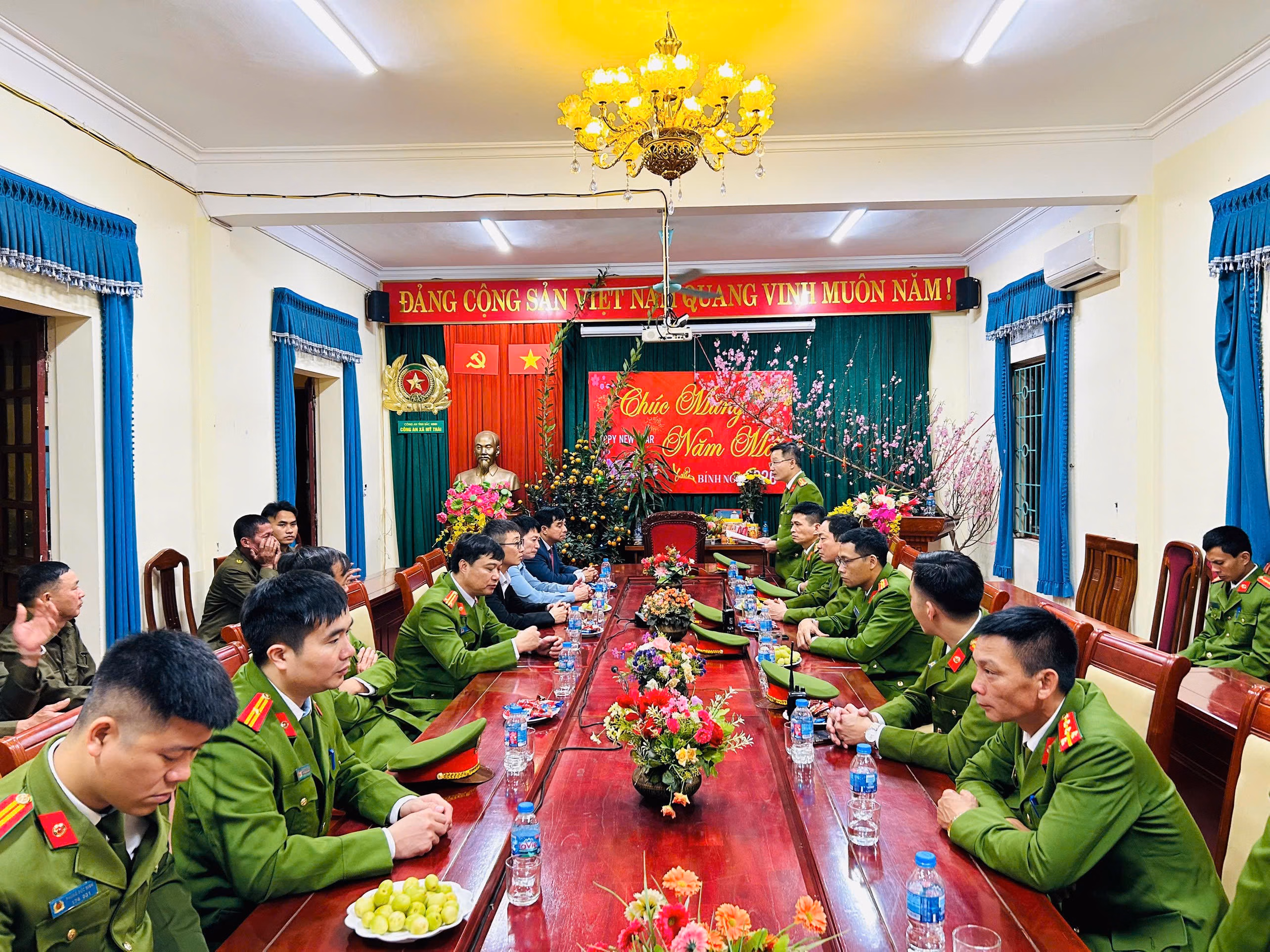 Nhân dịp này, đồng chí Ngô Thanh Linh - Bí thư Đảng ủy, Chủ tịch Hội đồng nhân dân xã Mỹ Thái đã đến thăm, chúc Tết và động viên cán bộ, chiến sĩ Công an xã đang trực tiếp làm nhiệm vụ trên địa bàn.