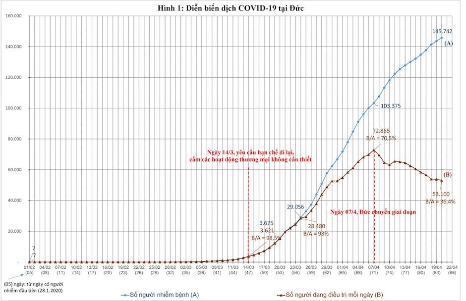 - Nhóm 1: Đức, dân số 83,8 triệu người, chuyển giai đoạn 7/4: tỉ lệ người nhiễm Covid-19 trên 1 triệu dân là 1.233 người (lớn hơn rất nhiều so với 16,4 người trên 1 triệu dân); tổng số người đang điều trị tại bệnh viện: 72.865; tỉ lệ người đang điều trị /1 triệu dân: 870 (lớn hơn rất nhiều so với 6,9 người/1 triệu dân).