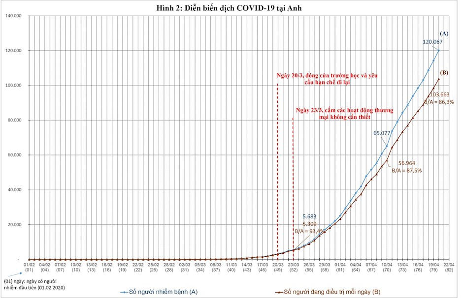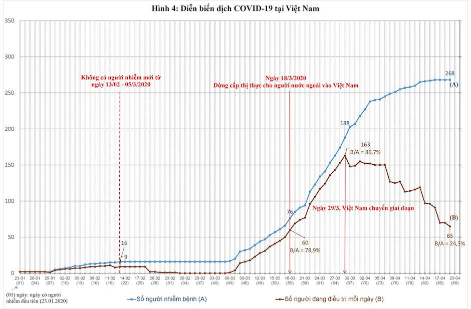 + Thái Lan, dân số 69 triệu người, chuyển giai đoạn 8/4: tỉ lệ người nhiễm trên 1 triệu dân là 34 (cao hơn tỉ lệ 16,4/1 triệu dân một chút); tổng số người đang điều trị: 1.451; tỉ lệ người điều trị/1 triệu dân: 21 (cao hơn tỉ lệ 6,9 người/1 triệu dân 1 chút).