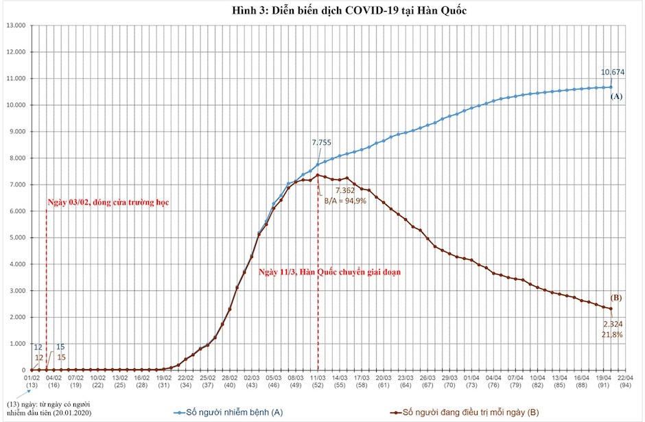 Trong 18 nước khác có số người nhiễm dưới 100.000 và trên 10.000, Hàn Quốc đã chuyển giai đoạn từ 11/3: Số người phải điều trị đạt đỉnh là 7.562 người vào ngày này, sau đó giảm dần và ngày 20/4 chỉ còn 2.324. Tỉ lệ người phải điều trị ở bệnh viện so với số người nhiễm giảm từ 95% xuống còn 22% (HÌNH 3).